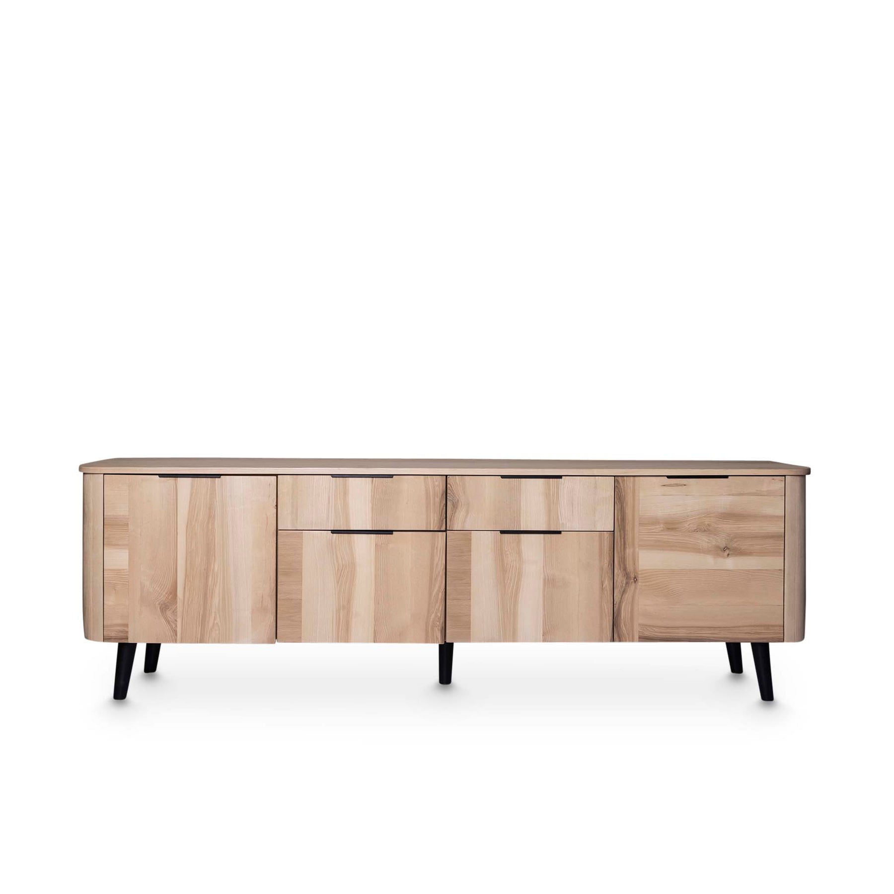 Designed with both function and form in mind, the Willow Sideboard offers generous storage through its combination of drawers and cabinets, perfect for dinnerware, glassware, or household essentials. The interior shelving provides practical organization while maintaining a clean, minimalist aesthetic. Rounded corners and slender black legs add a refined contrast, giving the sideboard a light and elegant silhouette that complements modern, Scandinavian, or organic-inspired interiors.