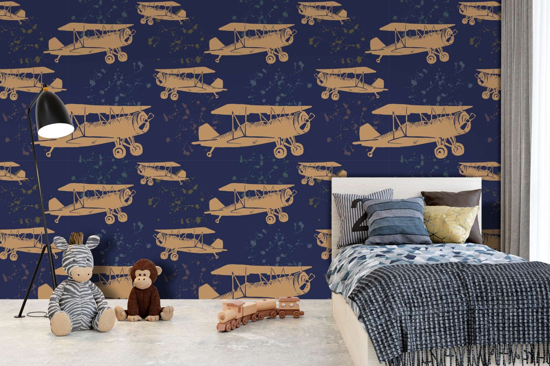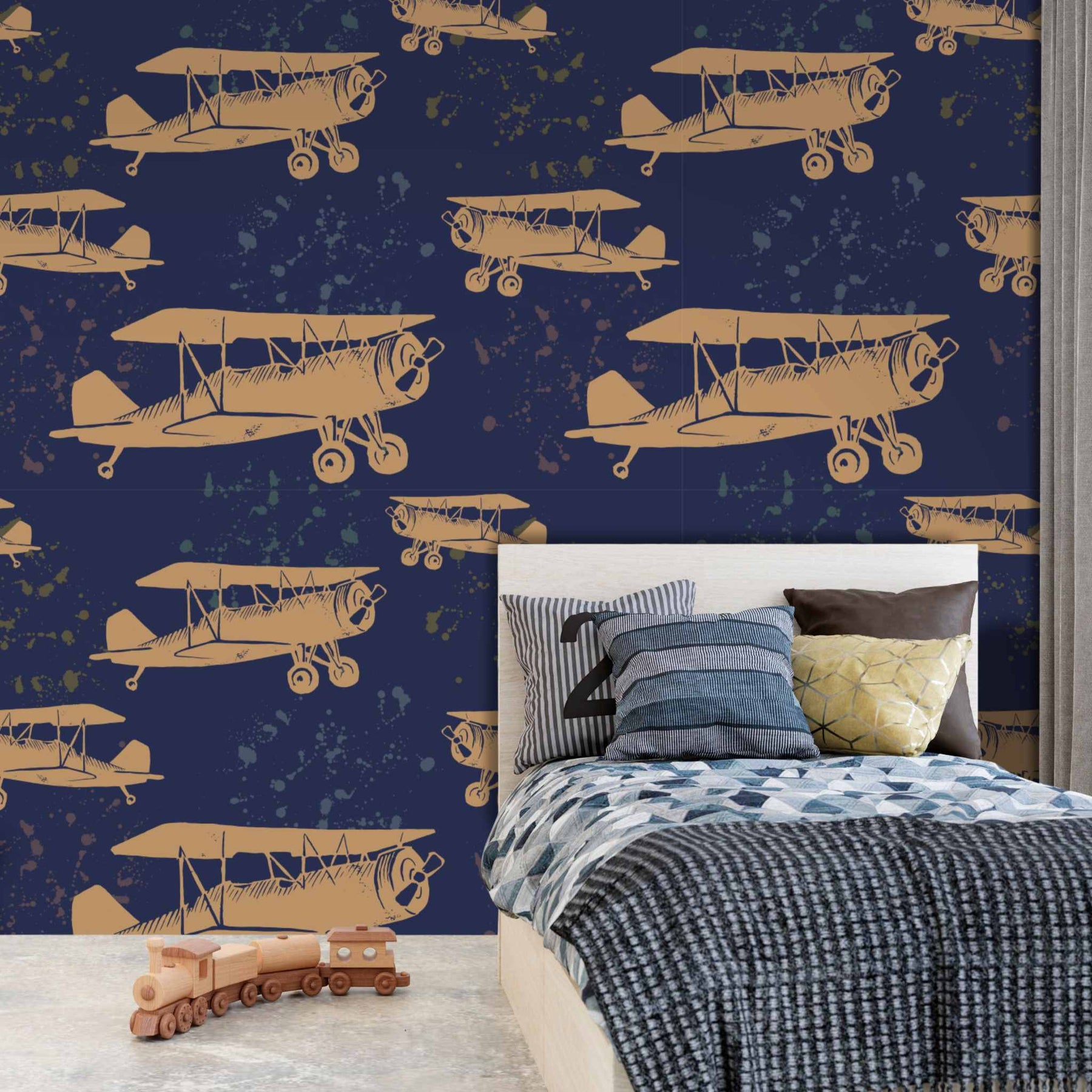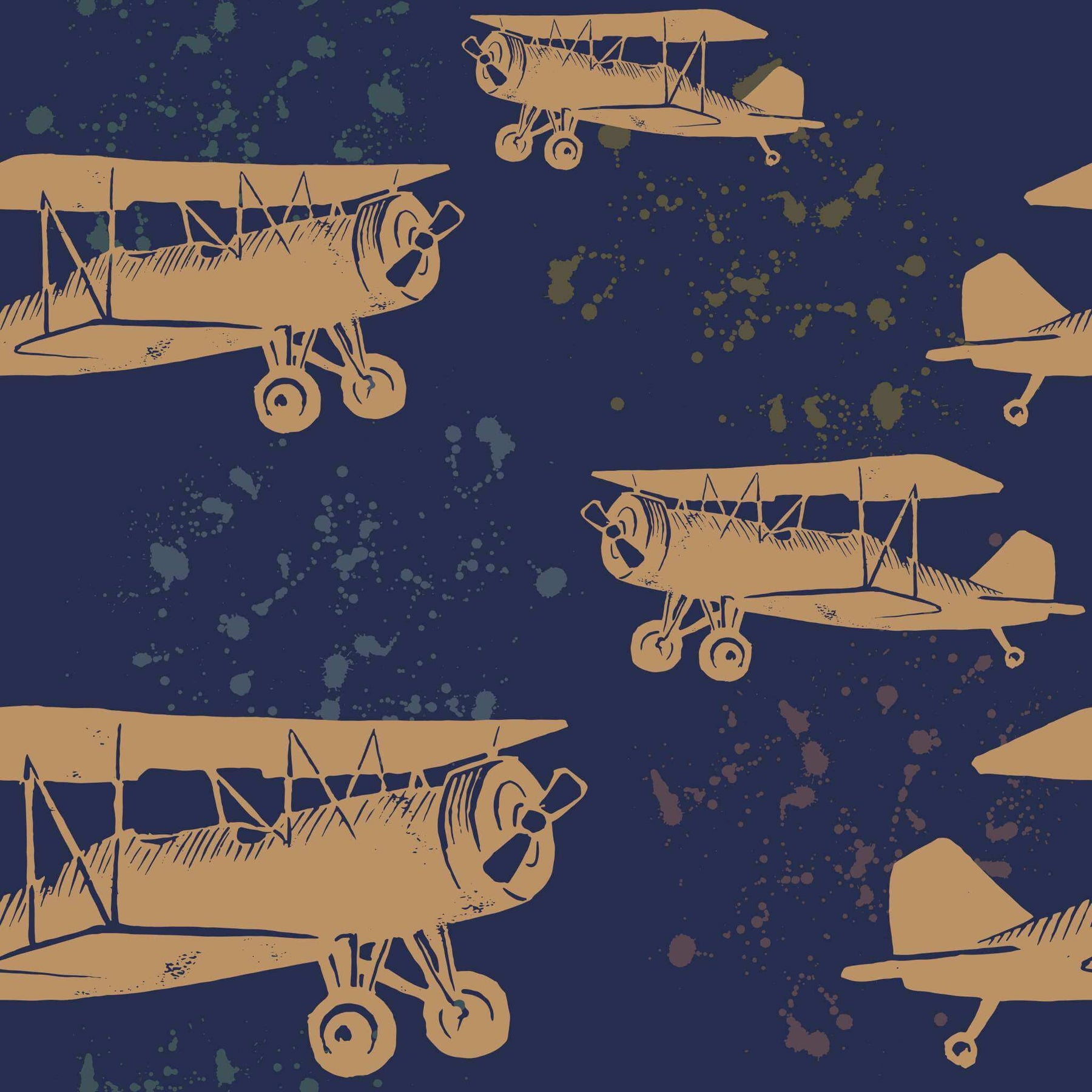 A vintage plane motif with a navy background. The Go Fly wallpaper is a custom printed-to-order, high-quality, textured wallpaper that is scrubbable and scratch resistant—ideal for the office, bedroom, passage, guest cloakroom or any other indoor living space.