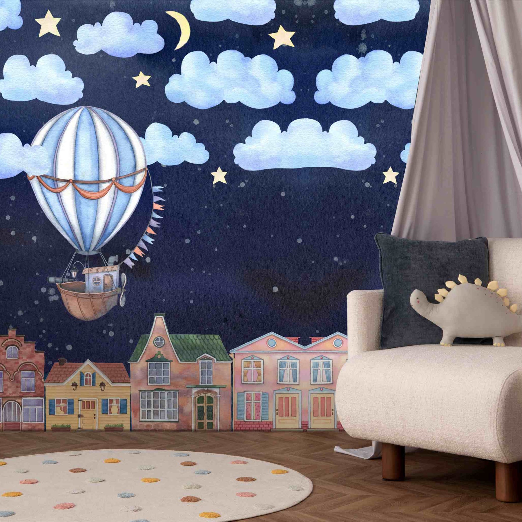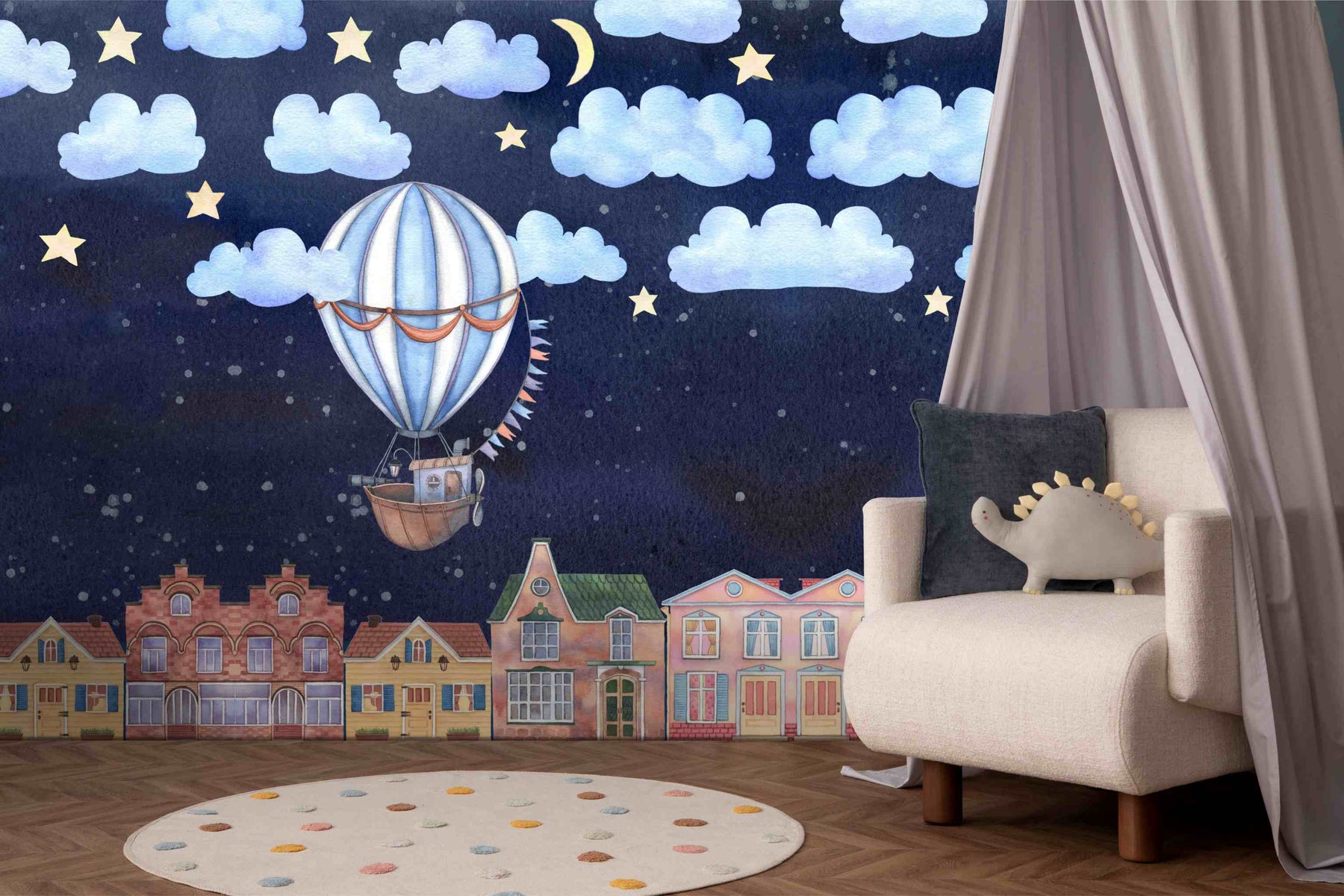 Bring a calm and soothing feature wall to the room with this playful wallpaper. The Good Night wall mural is a custom printed-to-order, high-quality, textured wallpaper that is scrubbable and scratch resistant—ideal for the office, bedroom, passage, guest cloakroom or any other indoor living space.