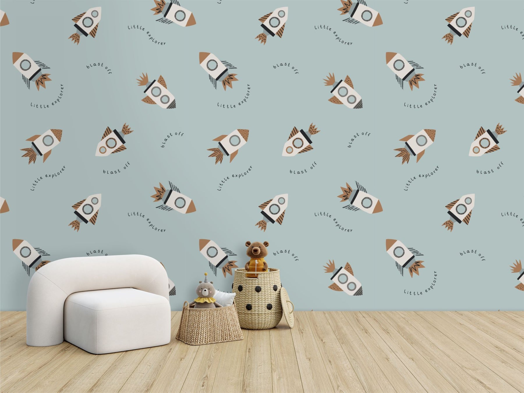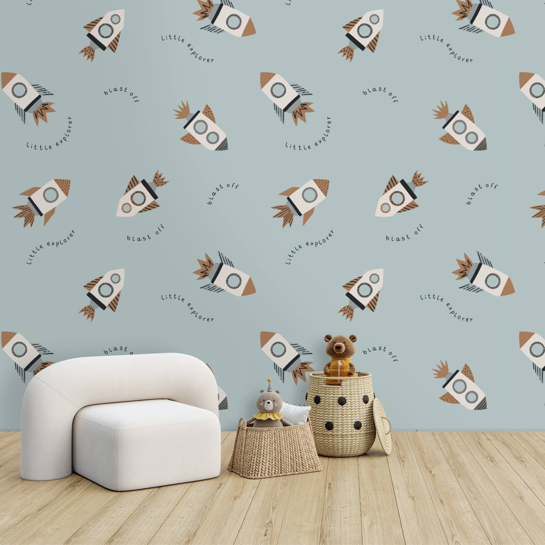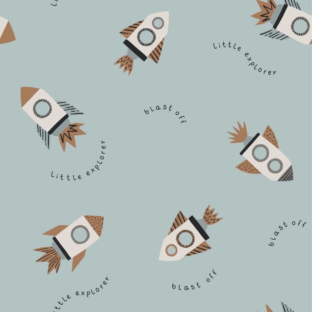 Blast off into style with the Little Explorer Blast Off Wallpaper! Imagine rockets zooming across a dreamy duck egg blue sky, accompanied by whimsical phrases like ‘blast off ’and ‘little explorer. ’Ideal for young dreamers and explorers, it turns any room into a launchpad for creativity and wonder. Let their dreams take flight in a room that’s as imaginative as they are!