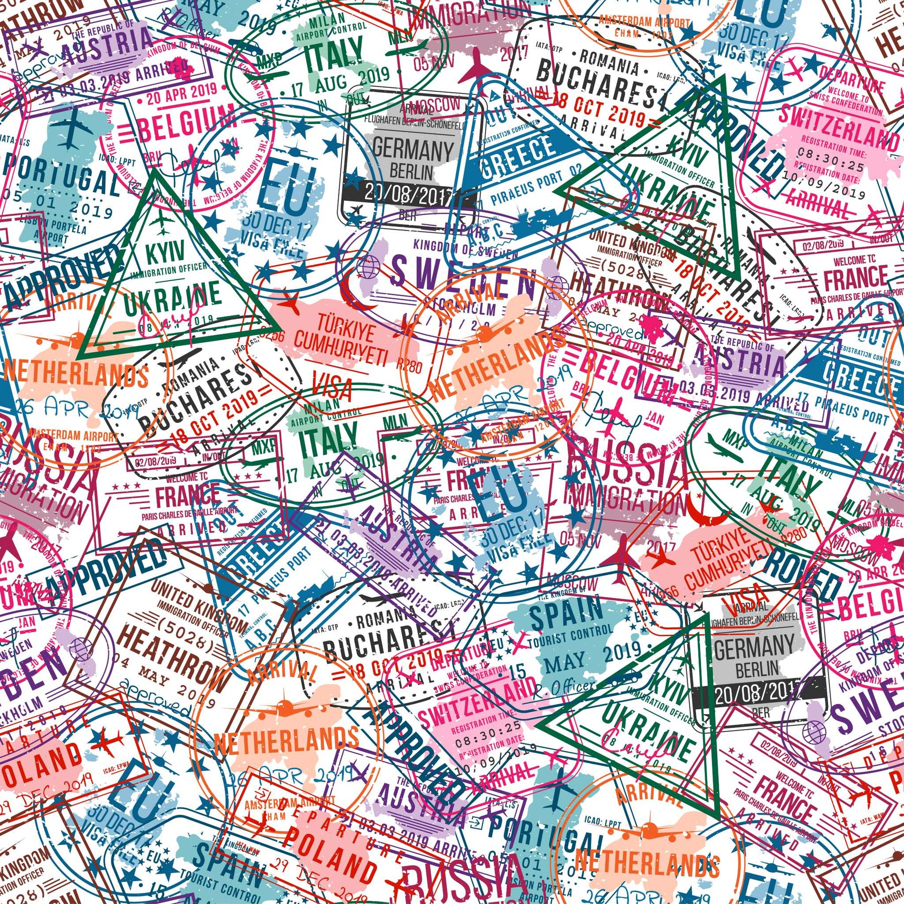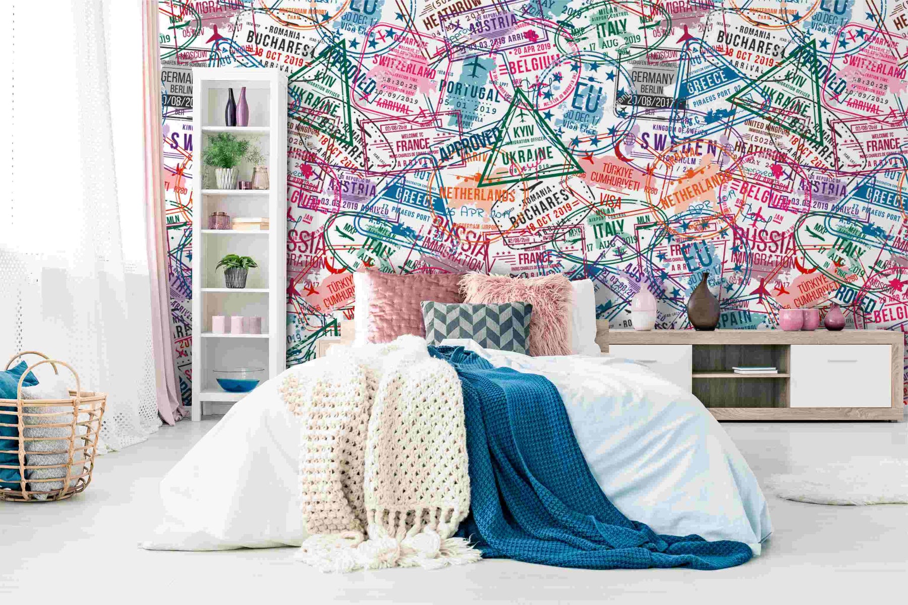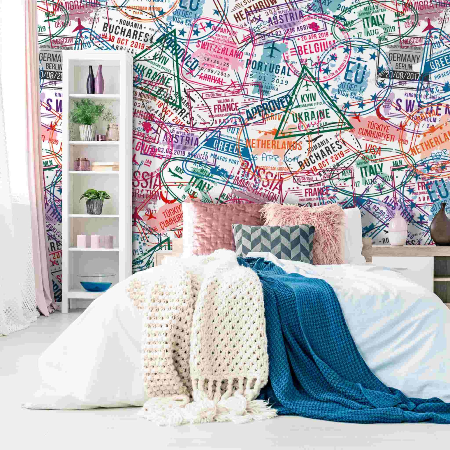 Passport wallpaper with layered international travel stamps in bold colours creating a vibrant global design by Giava Interiors, South Africa.