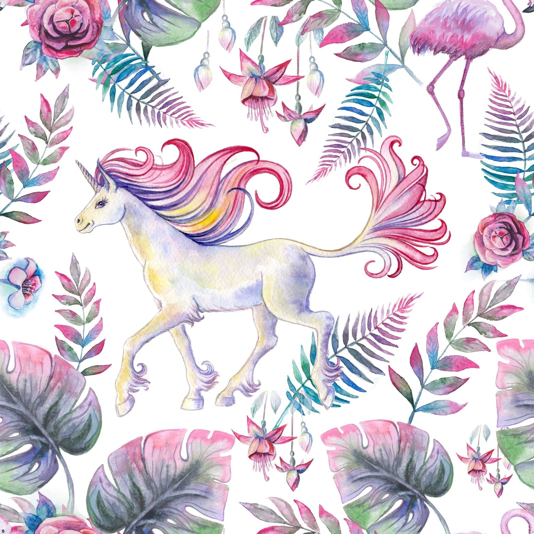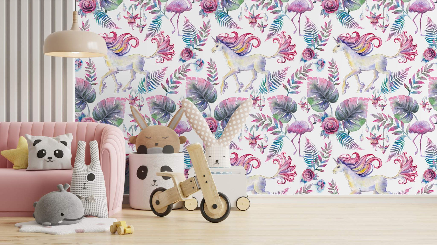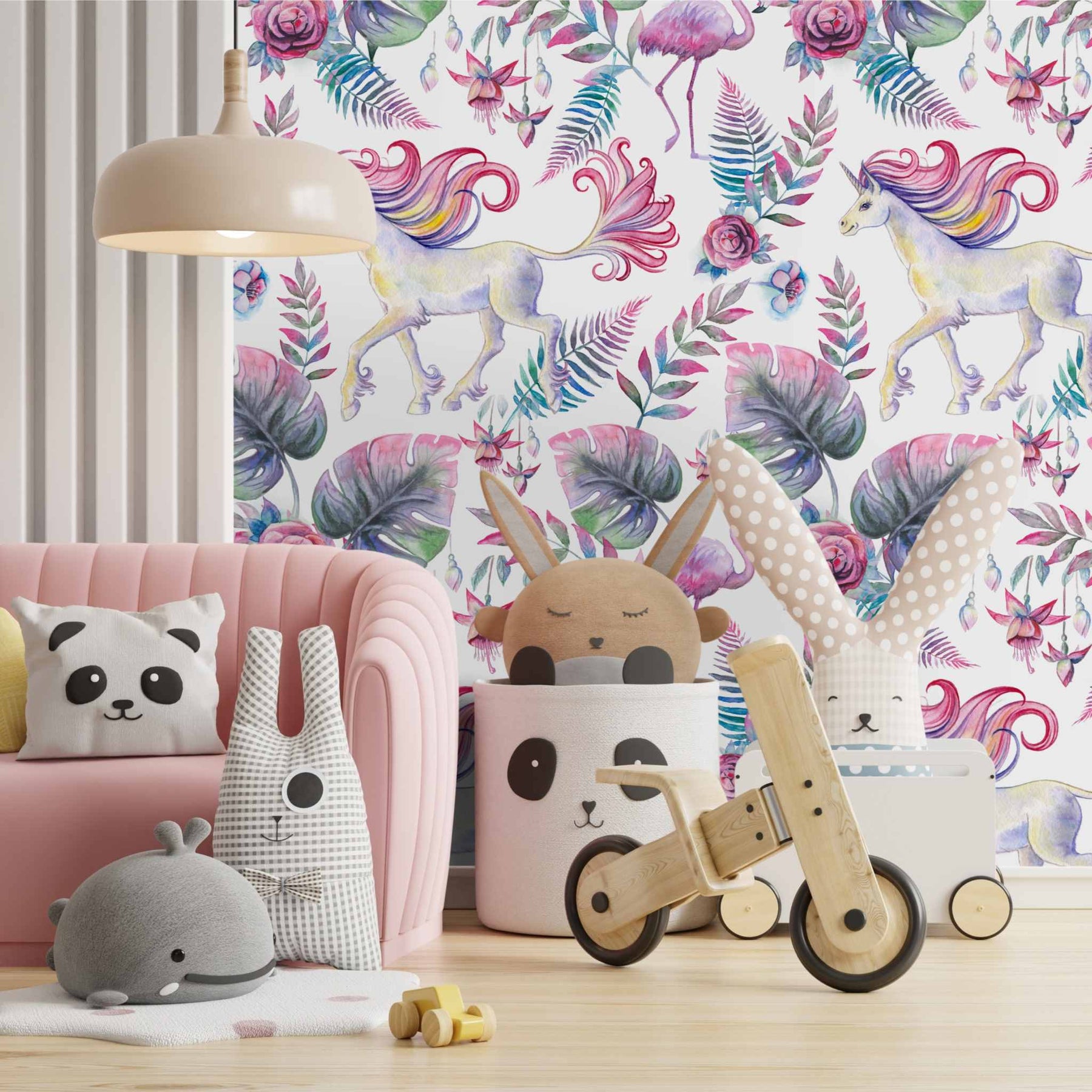 This enchanting unicorn wallpaper features a graceful unicorn surrounded by lush tropical leaves, florals, and whimsical details in soft pinks, greens, and dreamy pastels. Designed to spark imagination, it creates a magical atmosphere perfect for girls’ bedrooms, nurseries, or playrooms. The watercolor style adds an artisanal, storybook charm while remaining elegant enough to grow with your child, making it a timeless feature wall choice for joyful, creative interiors.