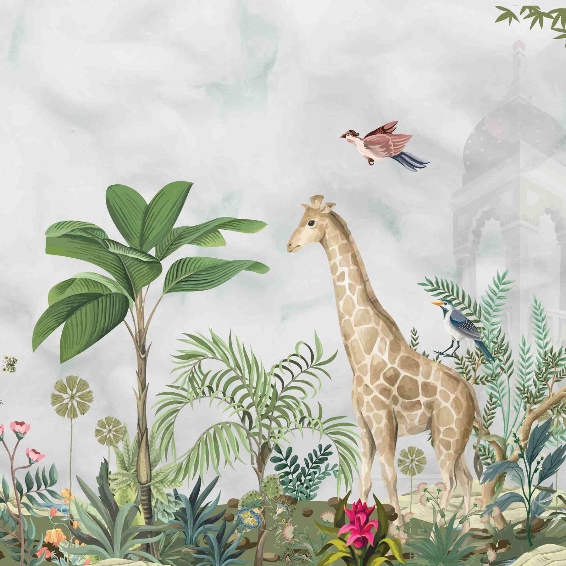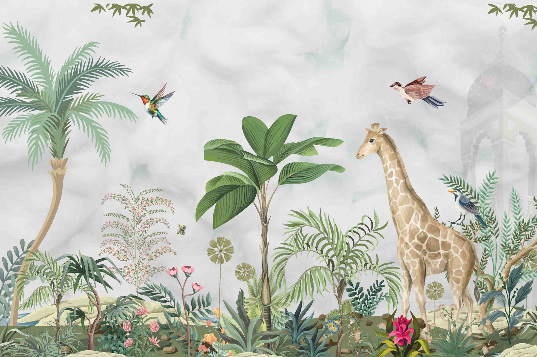 Transform your child’s space into a whimsical escape with the Safari Cloud Kingdom wall mural. This enchanting watercolor design features a friendly giraffe, exotic birds, and lush tropical botanicals, all set against a dreamy, cloud-washed background.